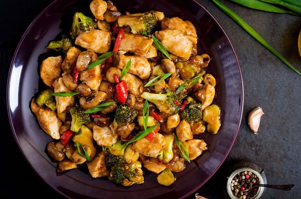 Renkli biberler ve soya soslu tavuk, makarna ve salata ile servis edilir. Yanında patates tercih edildiğinde +10 tl fiyat farkı olmaktadır.